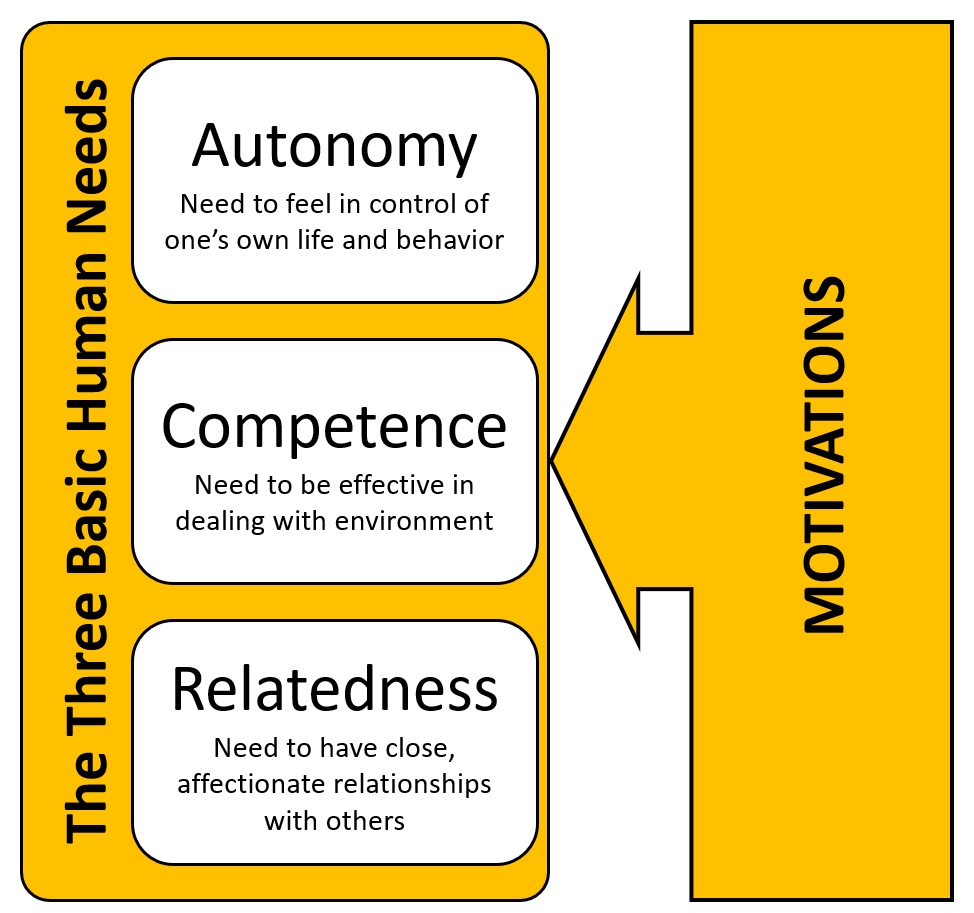 As illustrated above, SDT explains that humans’ behaviors are influenced by the intrinsic and extrinsic motivations we have described earlier. These motivations drive humans to satisfy the three needs of autonomy, competence, and relatedness, which SDT labels as basic human needs (Deci & Ryan, 2008). Humans need to feel in control of their life and behavior. That is the autonomy need (Ackerman, 2019). Humans also need to master skills and feel effective in dealing with their environment. That is the competence need (2019). Finally, humans need to have a sense of belonging and affectionate relatedness with other humans. That is the relatedness need (2019).