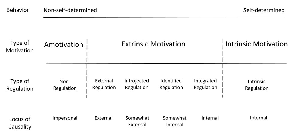SDT goes further in its differentiation between the two types of motivation by defining a self-determination continuum consisting of several nuances of motivation varying from the non-self-determined extreme where humans are unmotivated (amotivation state), all the way to intrinsic motivation on the self-determined extreme, passing through increasing shades of extrinsic motivation (Ryan & Deci, 2000b).