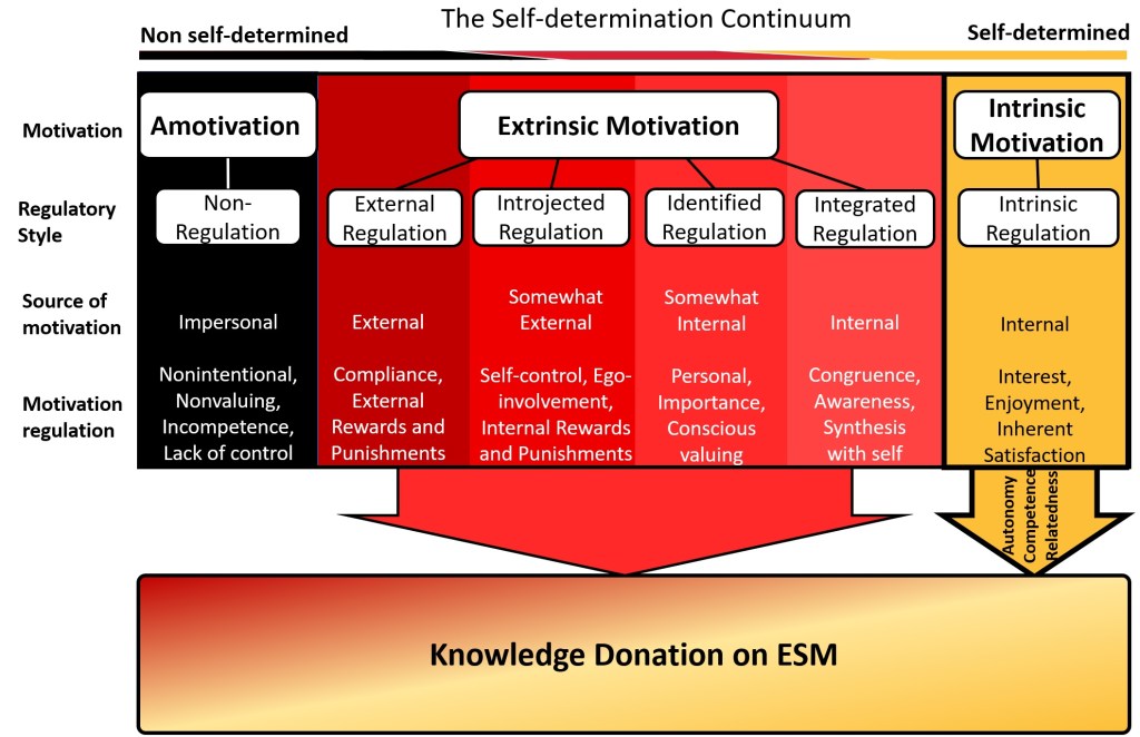 This conceptual framework helps us see that knowledge donation can be driven by extrinsic and intrinsic motivations. Furthermore, as we zoom into the intrinsic motivations that we are trying to understand, we can further discern three different types of intrinsic motivation driving factors in alignment with the three basic human needs of the SDT. Accordingly, knowledge donation can be affected by autonomy driven intrinsic motivation factors, competence driven intrinsic motivation factors, and relatedness or connectedness driven intrinsic motivation factors as the three labeled arrows above illustrate.